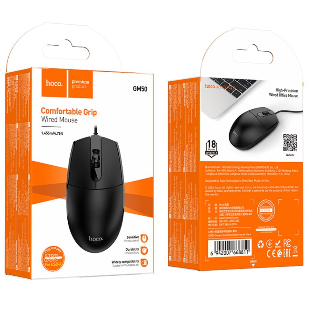 Ενσύρματο Business Ποντίκι Hoco GM50 League με 3 Πλήκτρα DPI 1000 Μαύρο. Διαστάσεις: 116x62.5x37.5mm, Βάρος: 66g