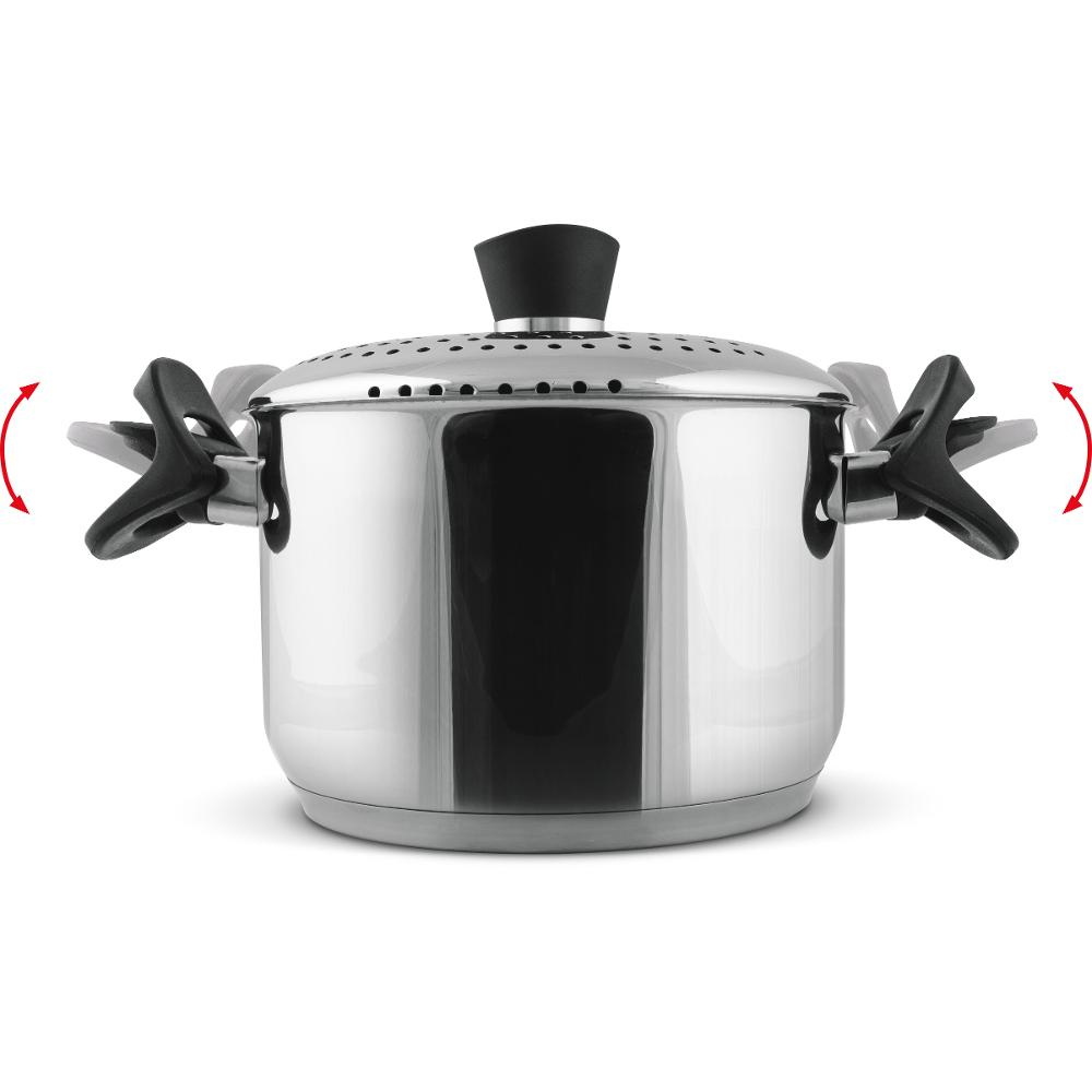 Κατασκευασμένο από ανοξείδωτο ατσάλι πρώτης κατηγορίας. Εξοπλισμένο με ισχυρό πάτο, η κατσαρόλα μαζί με το καπάκι είναι κατασκευασμένη από πρώτης τάξεως ανοξείδωτο χάλυβα. Το καπάκι με μηχανισμό αποστράγγισης από ανοξείδωτο χάλυβα και ειδική λαβή που σχηματίζεται από αναδιπλούμενες λαβές για να στραγγίζετε άνετα τα ζυμαρικά σας. Στήριγμα από βακελίτη για καπάκι και λαβή.