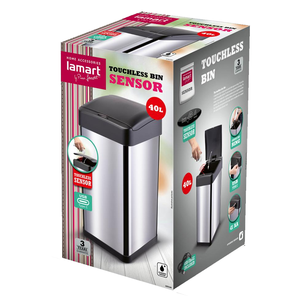 Κάδος απο ανοξείδωτο ατσάλι 40 λίτρων. Το καπάκι ενεργοποιείται με αισθητήρα κίνησης, χωρίς να χρειάζεται επαφή, το οποίο αποτρέπει την εξάπλωση μικροβίων. έχει κομψό σχεδιασμό για να ταιριάζει σε κάθε χώρο, λειτουργέι με 4 x AA μπαταρίες( Δεν περιλαμβάνονται)και διαθέτει και θύρα USB-C. Διαστάσεις: 32 x 27.3 x 60 cm.