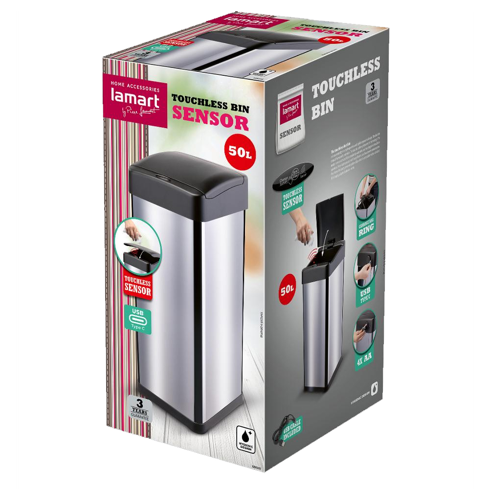 Κάδος απο ανοξείδωτο ατσάλι 50 λίτρων. Το καπάκι ενεργοποιείται με αισθητήρα κίνησης, χωρίς να χρειάζεται επαφή, το οποίο αποτρέπει την εξάπλωση μικροβίων. έχει κομψό σχεδιασμό για να ταιριάζει σε κάθε χώρο, λειτουργέι με 4 x AA μπαταρίες( Δεν περιλαμβάνονται)και διαθέτει και θύρα USB-C. Διαστάσεις: 32 x 27.3 x 70 cm.