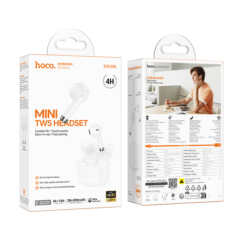 Wireless Hands Free Hoco EW205 Peaceful TWS Hi-Fi Audio Deep Bass v6.0 200mAh 4 Ώρες Ομιλίας και Θήκη Φόρτισης Λευκά