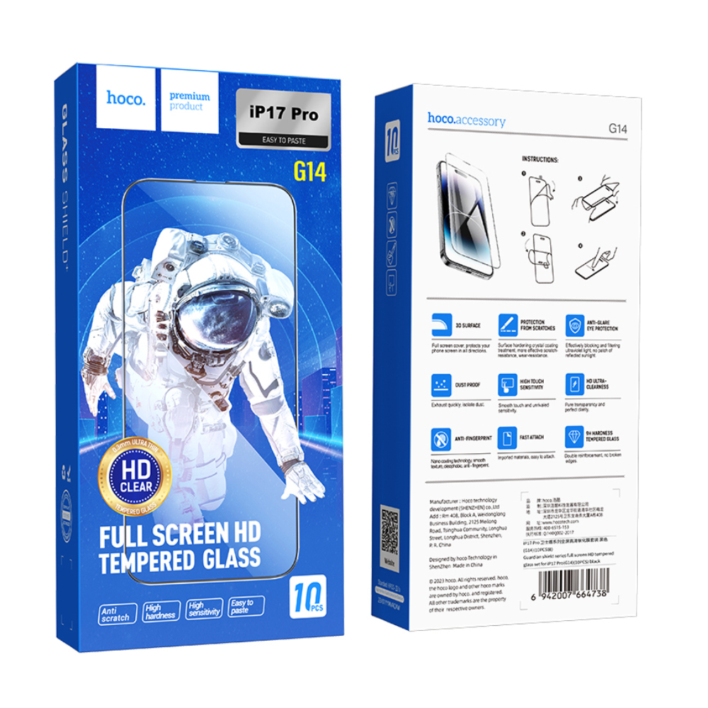 Tempered Glass Hoco Premium Series G14 0.33mm HD Full Screen Large Arc Edges Protection HD 3D για Apple iPhone 17 Pro Σετ 10 τεμ.