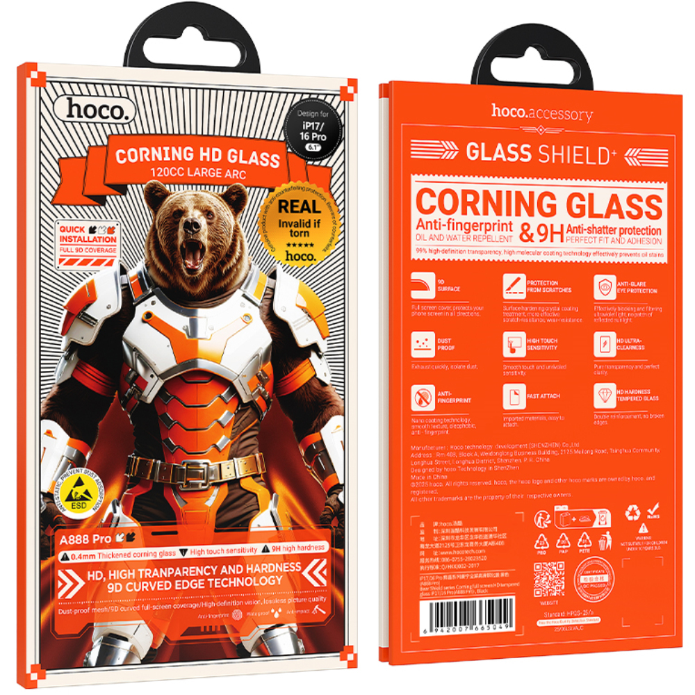 Tempered Glass Hoco Bear Shield A888 Pro Corning Glass Anti Fingerprint για Apple iPhone 17 16 Pro